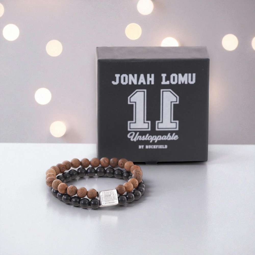 Express strength and elegance with this double-row bracelet, composed of black and brown pearls in a timeless design. In the center, a stainless steel bead engraved with the legendary name Jonah Lomu, a symbol of power and inspiration.