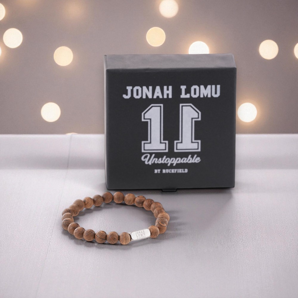 A natural, authentic accessory inspired by a rugby legend. Crafted from wood beads in warm, elegant tones. In the center, a stainless steel bead engraved with "Jonah Lomu", a symbol of power and respect.
