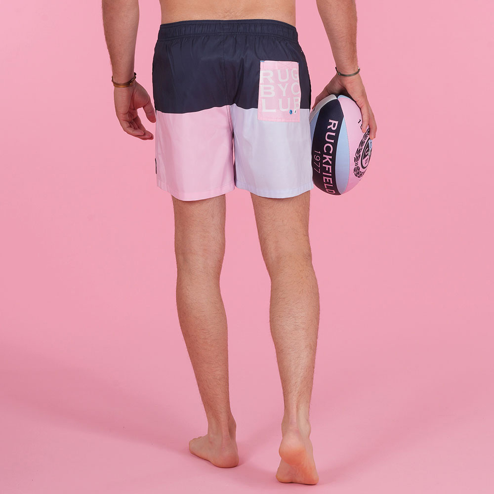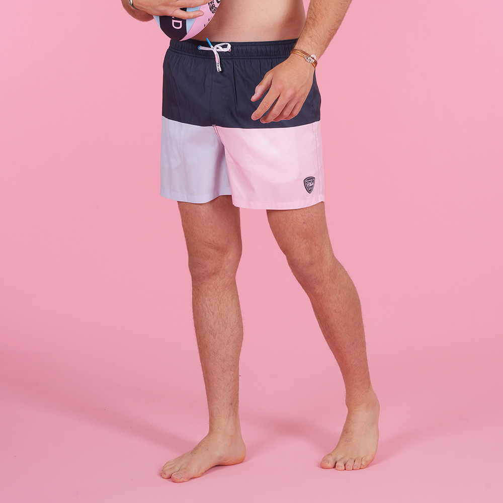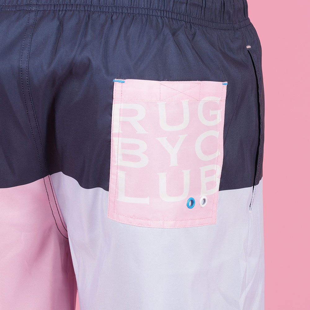 Make a fashion statement on the beach or in the pool with this colorblock swimsuit in modern shades of navy, sky blue and pink. Comfortable and practical, it features an adjustable drawstring waist, two side pockets and a back pocket to keep your essentials close at hand. Its classic cut makes it a summer essential.