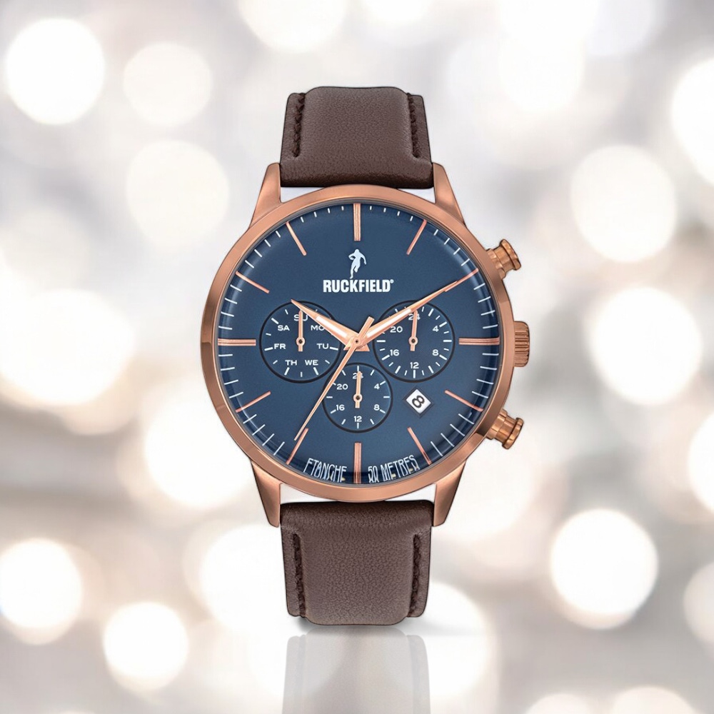 This Ruckfield Men's Watch model 685171 is distinguished by its elegant, masculine design. It features a 41 mm-diameter round case in robust, highly resistant steel. It has an analog display and extensive functions, such as date and multifunction. The brown leather strap adds a touch of sophistication and ensures comfortable wear. The movement is quartz and the watch is water-resistant to 50 meters (5 ATM). The watch closes with a simple buckle, and the mineral glass protects the display from scratches. The details of the watch, visible through the picture, add a special charm to this model.
