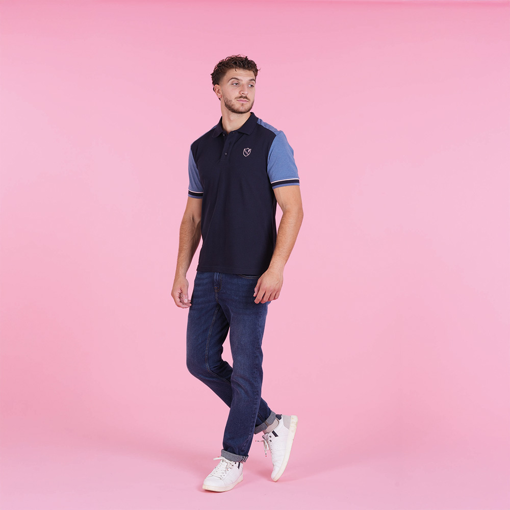 This short-sleeved polo revisits a classic with a modern twist. Its navy blue body contrasted by light blue sleeves creates a subtle, dynamic play of colors, ideal for an assertive casual look.