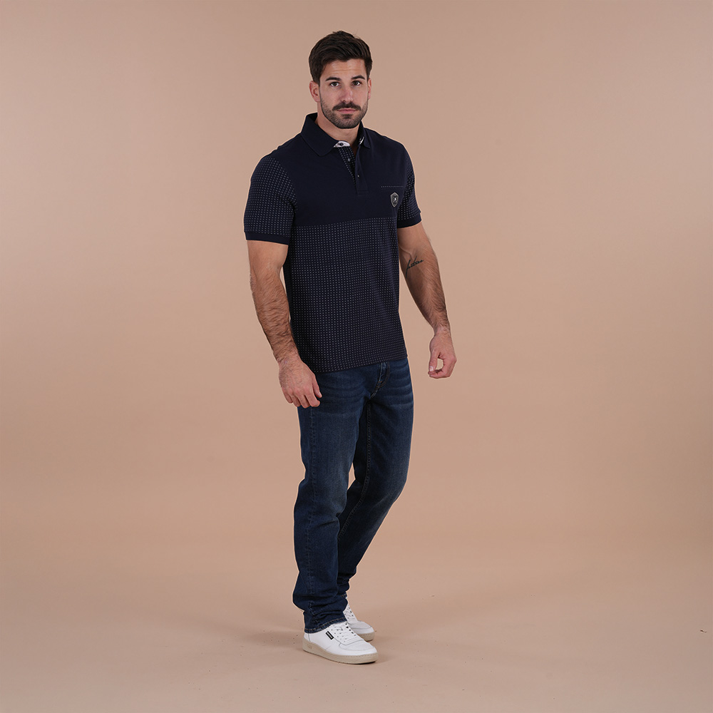 Solid navy blue all over the top (front and back) and a discreet polka-dot print on the sleeves, button placket, reverse of the false breast pocket just above the badge, and on the center front and back as well.