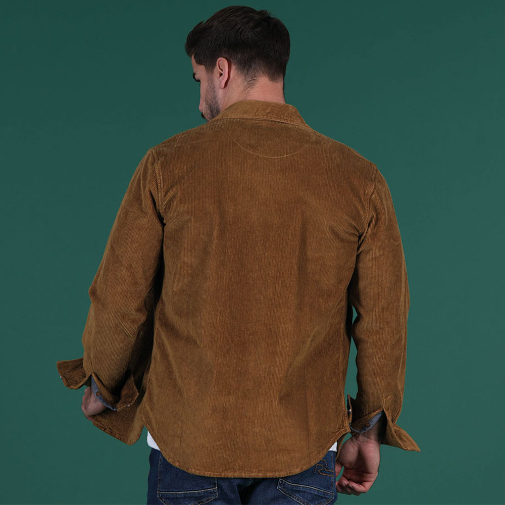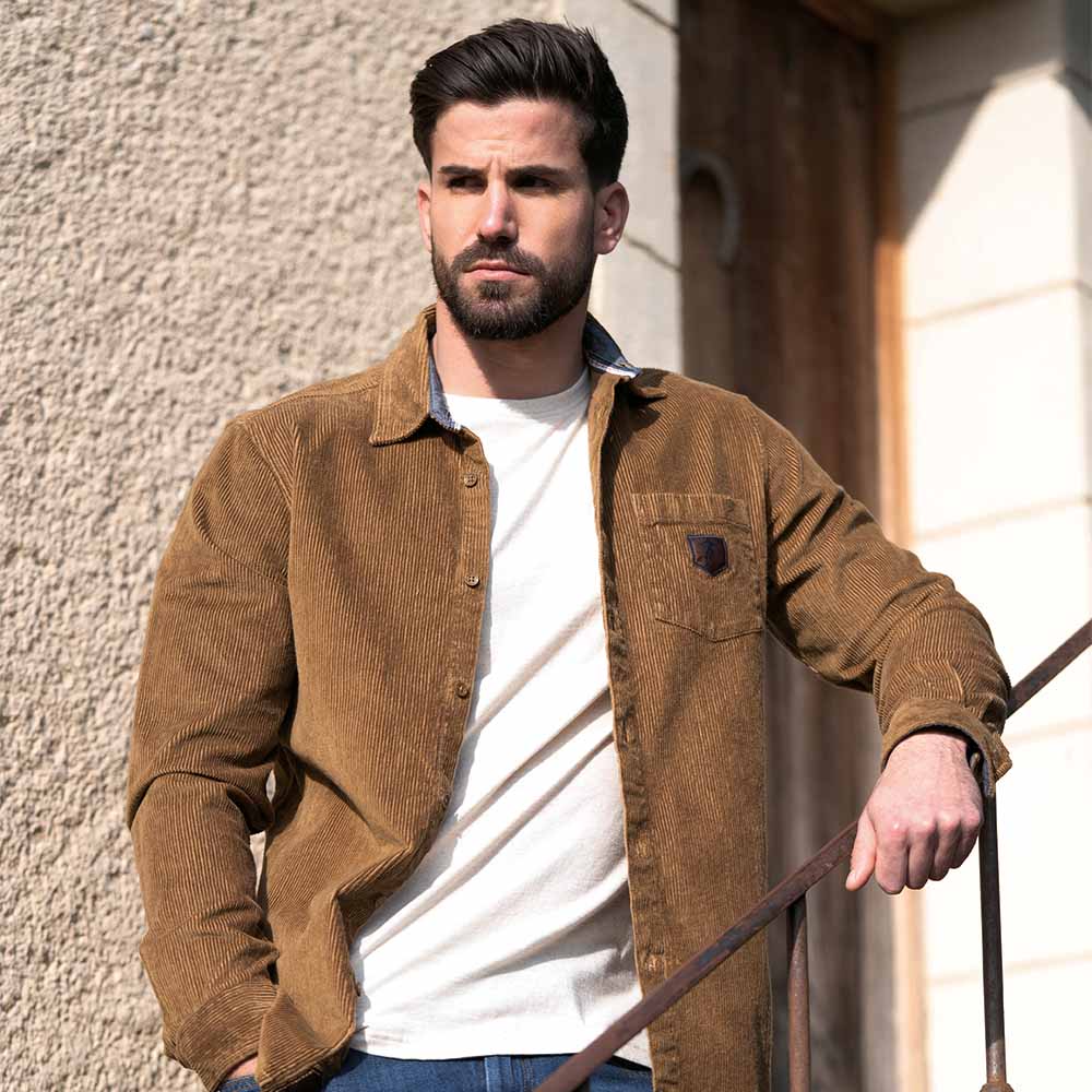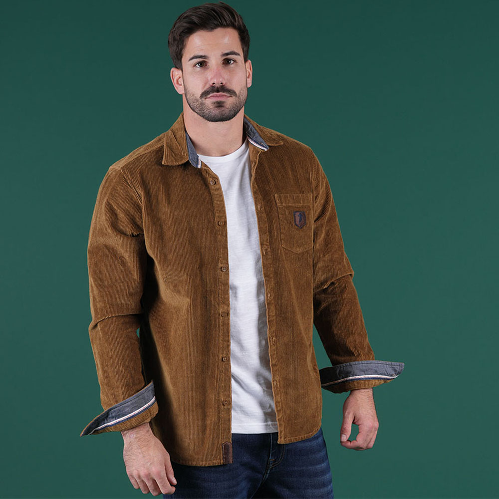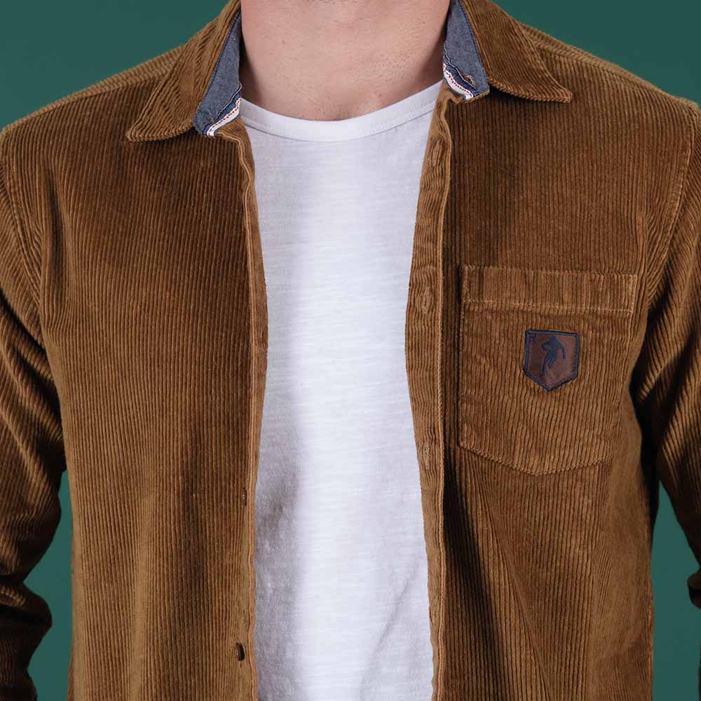 This long-sleeved, ice-brown velvet shirt is both soft and assertive. Its ribbed texture adds relief, while the embroidered patch on the chest signs the piece with character. Contrasts inside the collar and sleeve cuffs add a subtle touch of refinement, designed for those who love details that make a difference.