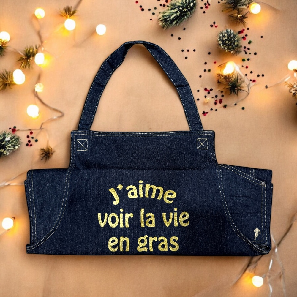 Ruckfield denim apron with "J'aime voir la vie en gras" screen print