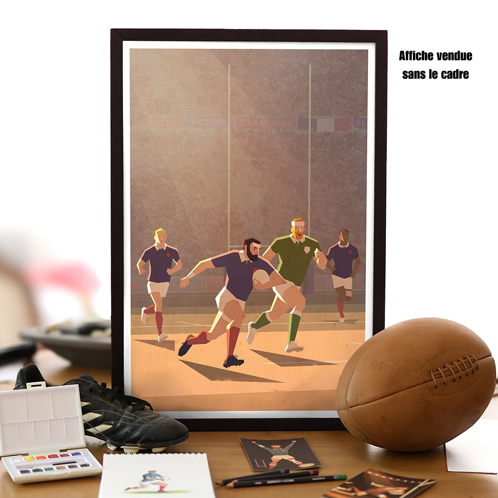 Droit à l’en-but capture l’instant décisif où tout bascule : la percée franche vers la ligne, la course puissante, la tension palpable des poursuivants. Cette illustration met en lumière l’intensité du rugby à travers une composition dynamique et des couleurs chaudes qui évoquent l’ambiance vibrante d’un stade en effervescence.