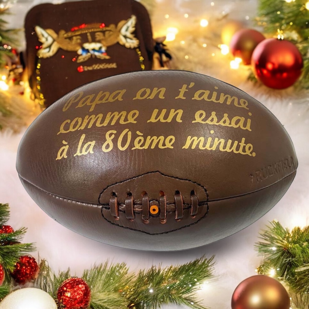 Magnifique ballon de rugby de collection en cuir marron personnalisé Papa on t'aime comme un essai à la 80ème minute !
