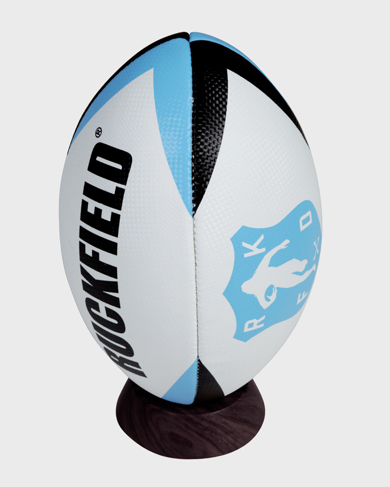 Ballon de rugby de plage en synthétique bleu et blanc avec sérigraphies.