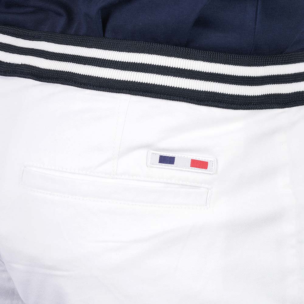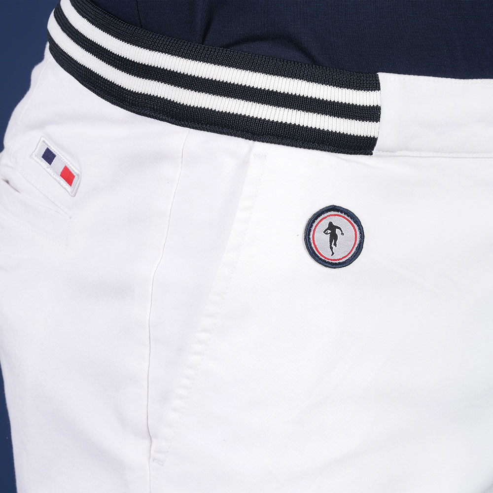 Conjuguez confort et style avec ce bermuda blanc signé Ruckfield. Il est équipé de deux poches latérales et deux poches arrière pour un côté pratique, et sa ceinture élastique noire et blanche assure un maintien parfait. La silhouette brodée de Sébastien Chabal sur la poche avant droite apporte une touche sportive et emblématique.