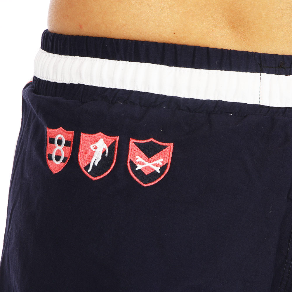 Short de bain Ruckfield bleu marine avec bordures blanches et écussons du French Rugby Club brodés au niveau de la poche arrière et numéro 8 de Sébastien Chabal sur la cuisse gauche.