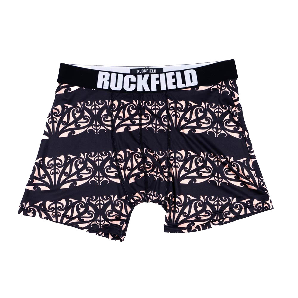 Boxer rugby maori en polyester recyclé pour un maxi confort. Vous retrouverez le logo Ruckfield imprimé sur la ceinture élastiquée et des imprimés maori.