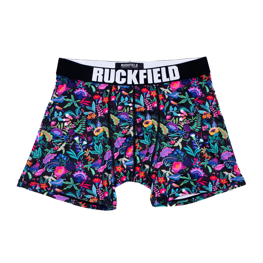 Boxer tropical en polyester recyclé pour un confort maximal. Retrouvez le Ruckfield sur la ceinture élastique et un imprimé fleuri et coloré.