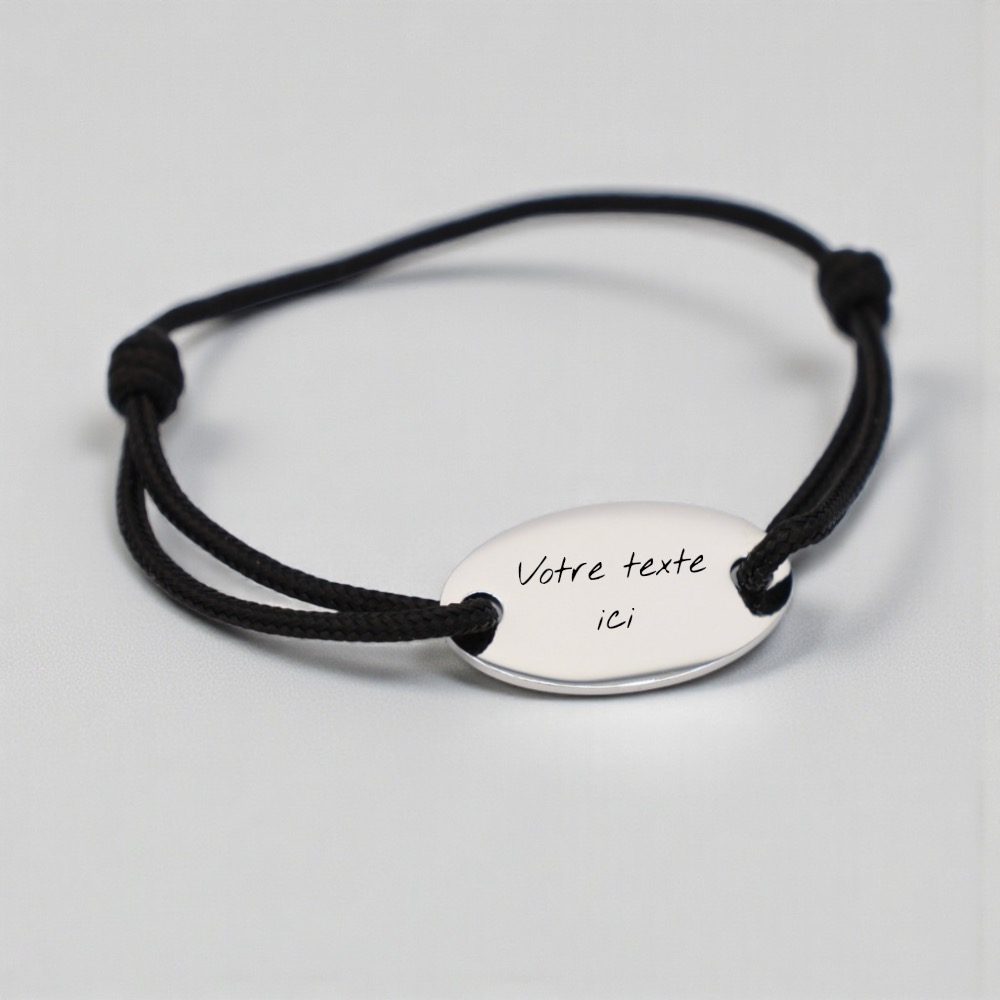 Le bracelet se compose d'un cordon réglable qui épouse parfaitement la courbe du poignet. Au centre, un médaillon ovale (3 cm de longueur) offre une surface idéale pour graver un prénom, une date, des initiales ou un message symbolique.
