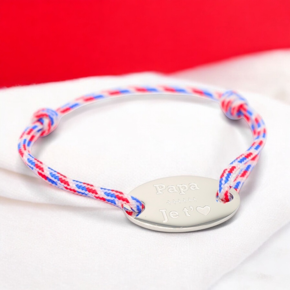 Ce bracelet en cordon ajustable est orné d’un médaillon ovale délicatement gravé des mots "Papa je t’aime" — une déclaration douce et intemporelle, portée à même la peau.