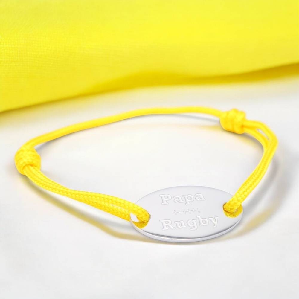 Bracelet cordon jaune médaillon ovale gravé "papa rugby"