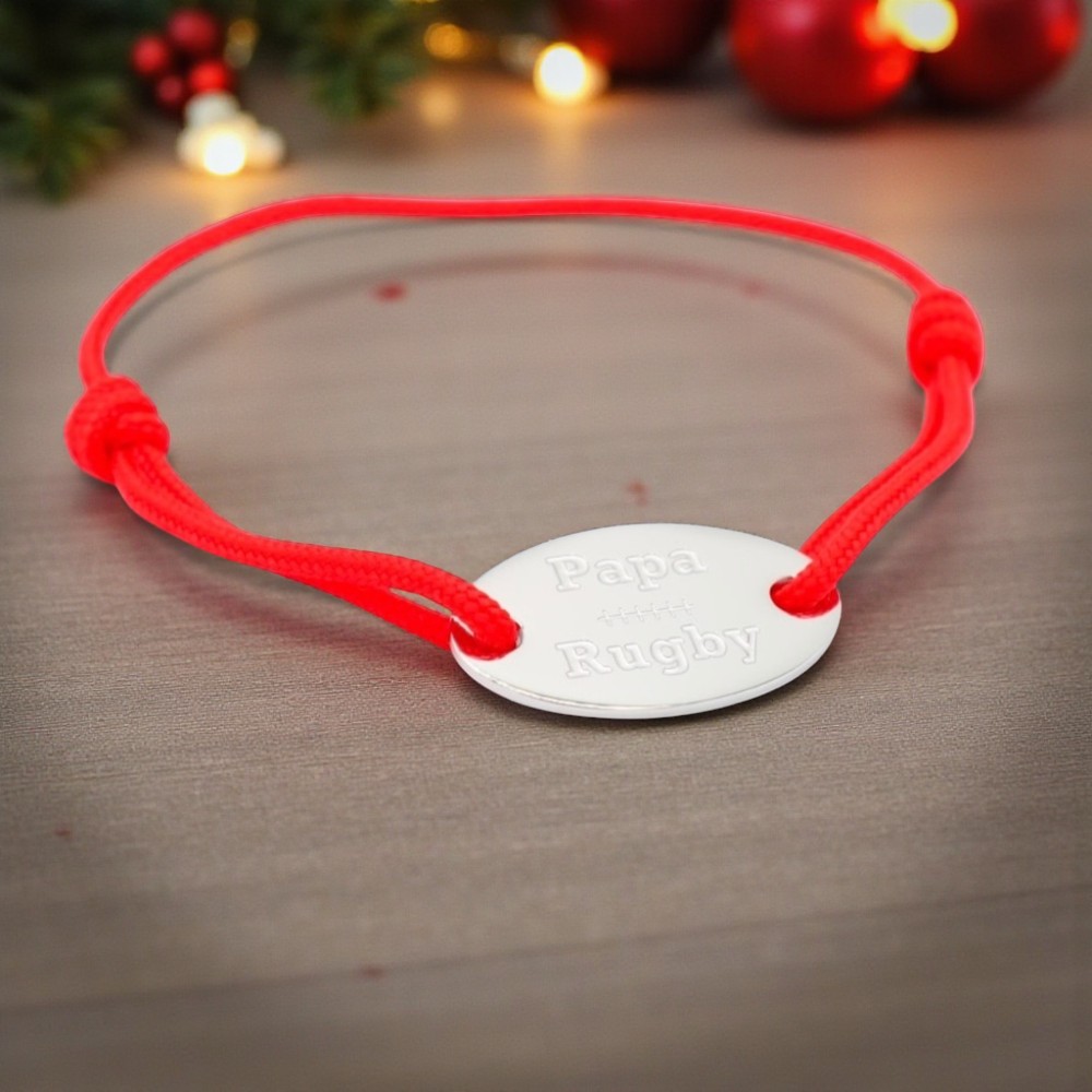 Bracelet cordon rouge médaillon ovale gravé "papa rugby"