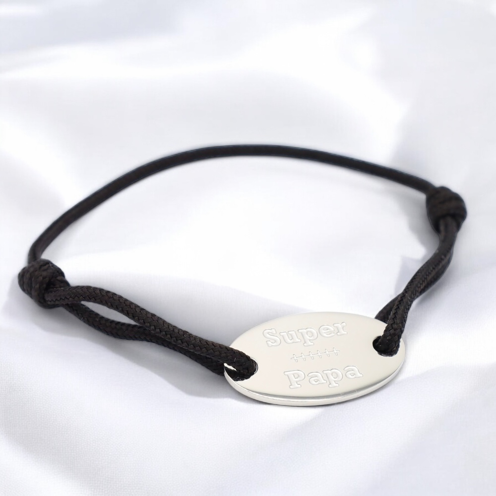 Ce bracelet en cordon ajustable est orné d’un médaillon ovale gravé des mots "Super Papa", comme un hommage discret mais fort à celui qui est toujours là, toujours présent, toujours unique.