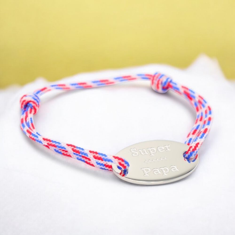 Bracelet cordon bleu, blanc, rouge Médaillon ovale gravé "Super Papa"