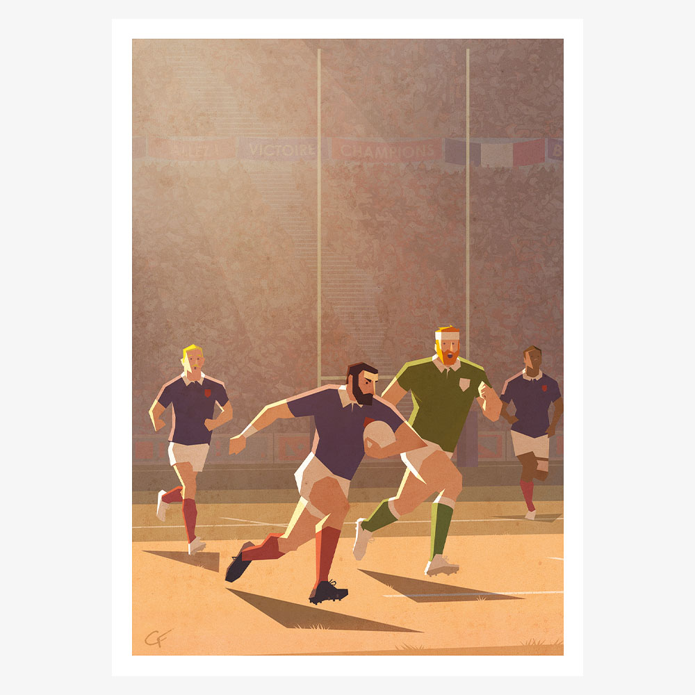 L’intensité d’une percée décisive, la puissance d’un sprint vers l’essai : cette illustration issue de la collection Les affiches de Cyril capture un moment clé d’un match de rugby.