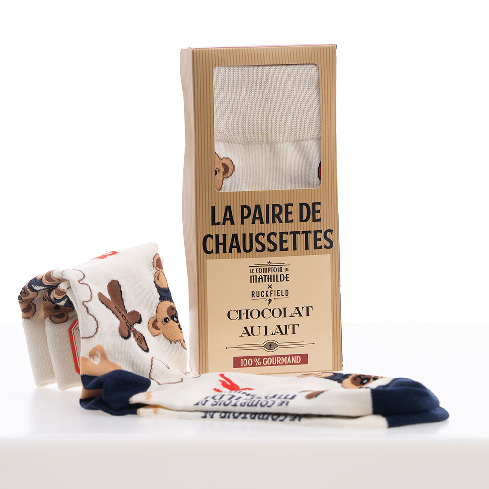 Fabriquées dans des matières douces et résistantes, présentées dans un coffret rappelant l'emballage d'une tablette de chocolat. Leur composition à base de coton majoritaire assure respirabilité et maintien, tandis que les fibres techniques apportent souplesse et durabilité.