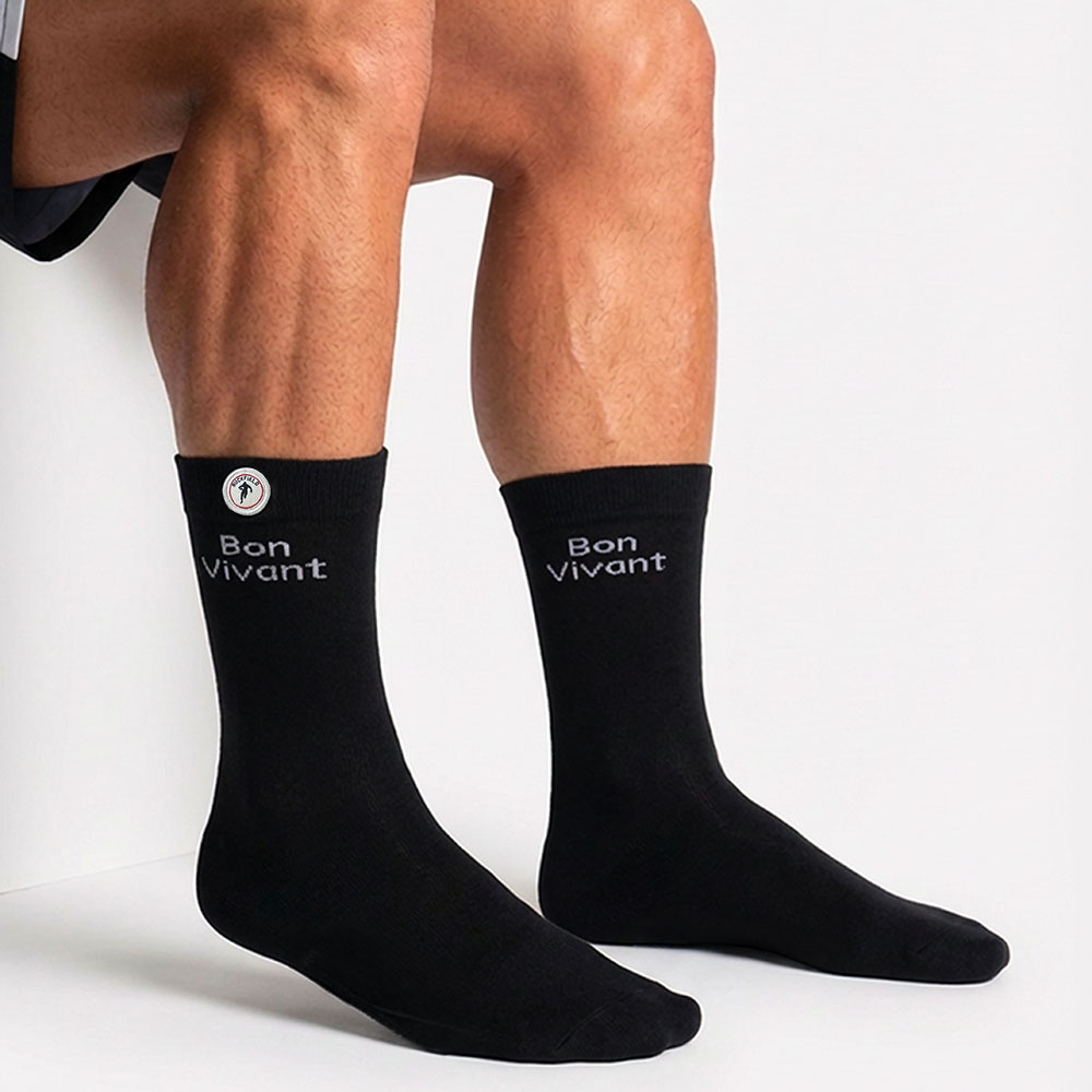 Affirmez votre personnalité jusque dans les détails avec cette paire de chaussettes noires brodée du message “Bon Vivant”. À la fois sobres et pleines de caractère, elles apportent une touche d’originalité discrète à toutes vos tenues.