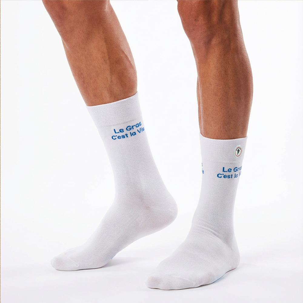 Célébrez le plaisir sans complexe avec ces chaussettes blanches au message audacieux « Le gras c’est la vie » brodé en bleu. Confortables et légères, elles ajoutent une touche d’humour et de personnalité à vos tenues, et rappellent qu’il est parfois bon de se laisser aller… même dans les petits plaisirs du quotidien !