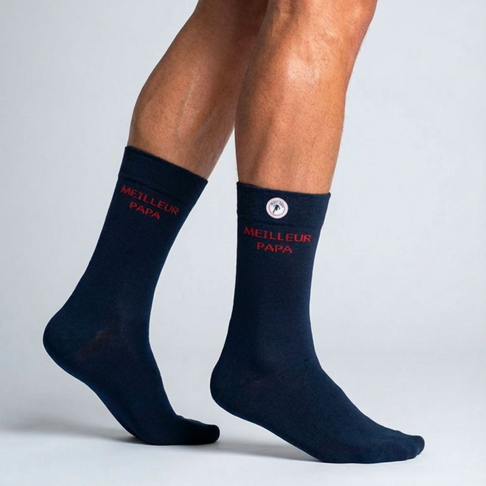 Ces chaussettes bleu marine portent en broderie rouge le message « Meilleur Papa », un petit clin d’œil qui fait chaud au cœur à chaque pas. Confortables et stylées, elles transforment le quotidien en moment spécial et rappellent subtilement que chaque papa mérite sa dose de reconnaissance… jusque dans les pieds !