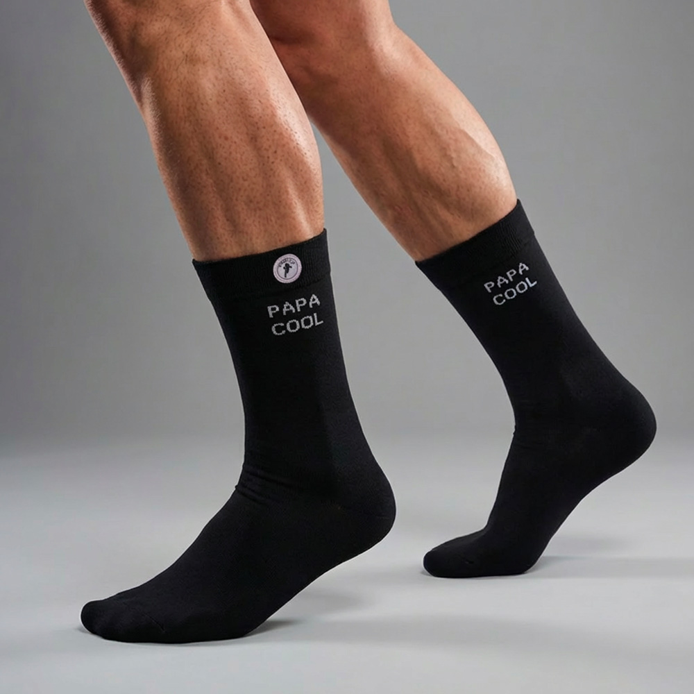 Pour les papas qui maîtrisent l’art du chill, ces chaussettes noires affichent fièrement « Papa Cool » en broderie blanche. Confortables et modernes, elles se glissent à vos pieds comme un clin d’œil à votre coolitude quotidienne. Idéales pour le week-end, le canapé, ou juste pour montrer que la classe peut aussi se porter aux chevilles.