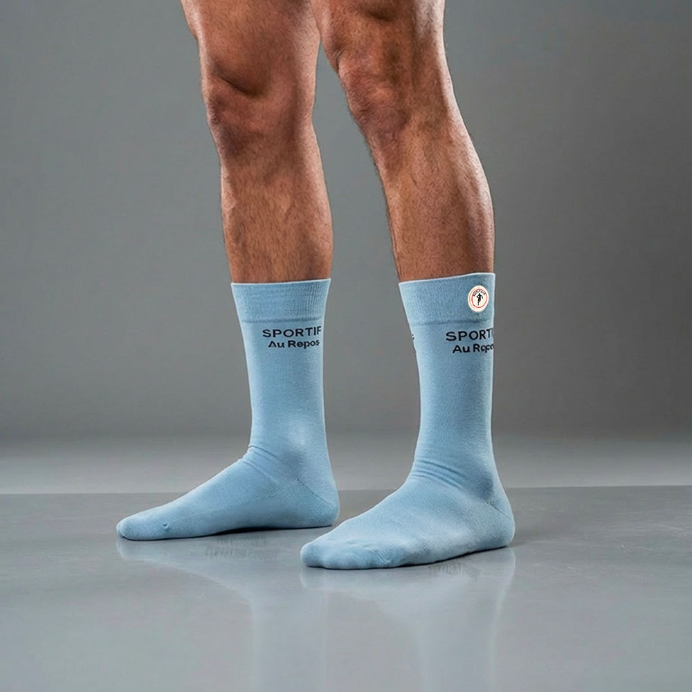Ces chaussettes bleu ciel combinent confort et caractère : un message brodé en bleu marine qui clame fièrement « Sportif au repos ». Idéales pour vos pauses, vos soirées canapé ou juste pour mettre un sourire à vos pieds, elles transforment chaque moment de détente en clin d’œil sportif. Un détail discret mais audacieux qui fait toute la différence.