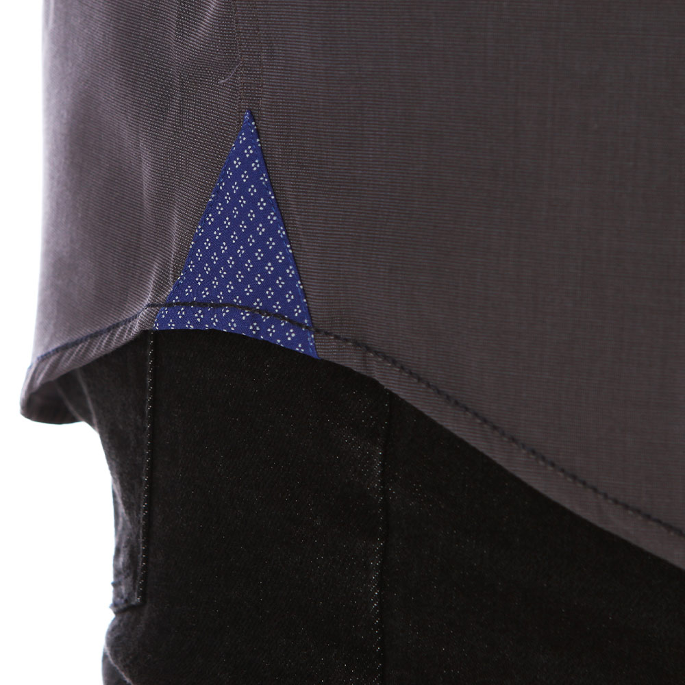 Chemise couleur anthracite très sobre, des broderies discrètes sont présentes sur la poitrine et le haut du dos, l'intérieur du col et les poignets. Elles sont travaillées avec du bleu marine à losanges blancs, très chic !