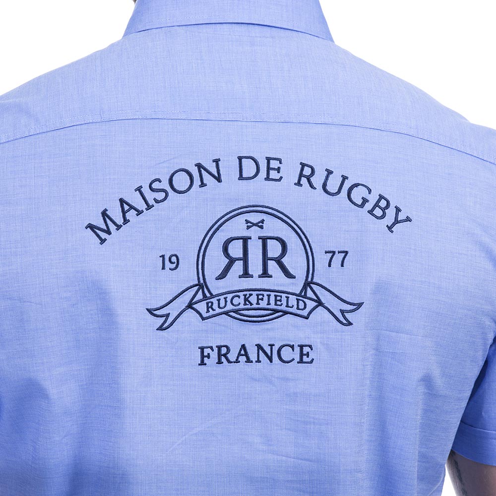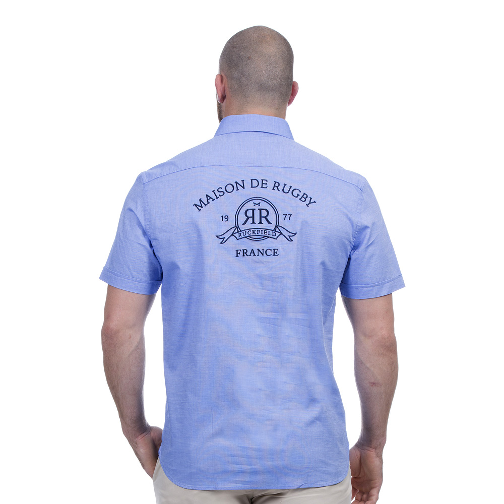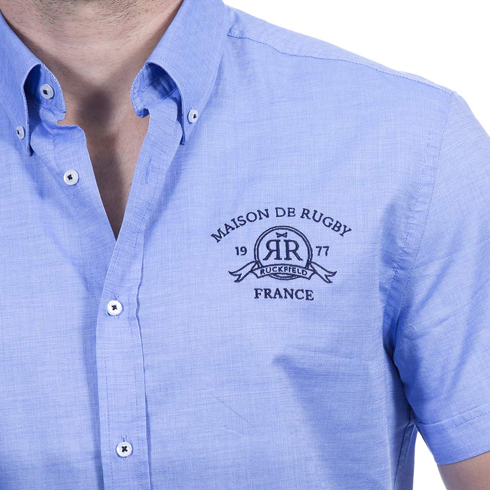 Chemise d'été en tissu 100% pur coton de couleur bleu ciel. Cette chemisette est un basique du vestiaire Ruckfield avec ses subtiles broderies sur la poitrine et sur le dos. Le plus, elle est disponible en grandes tailles !