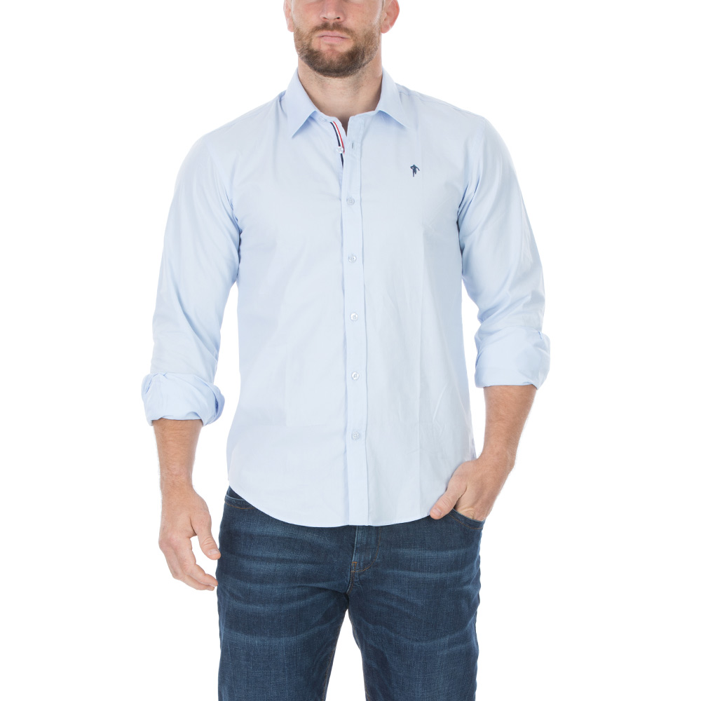 Coupée dans une belle popeline de coton, cette chemise manches longues blanche joue la carte de la France avec son galon tricolore sur la patte de boutonnage.