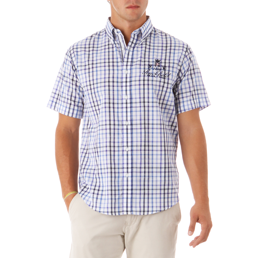 Chemise manches courtes carreaux bleu/ blanc, 100% coton. Broderies poitrine et intérieur col.