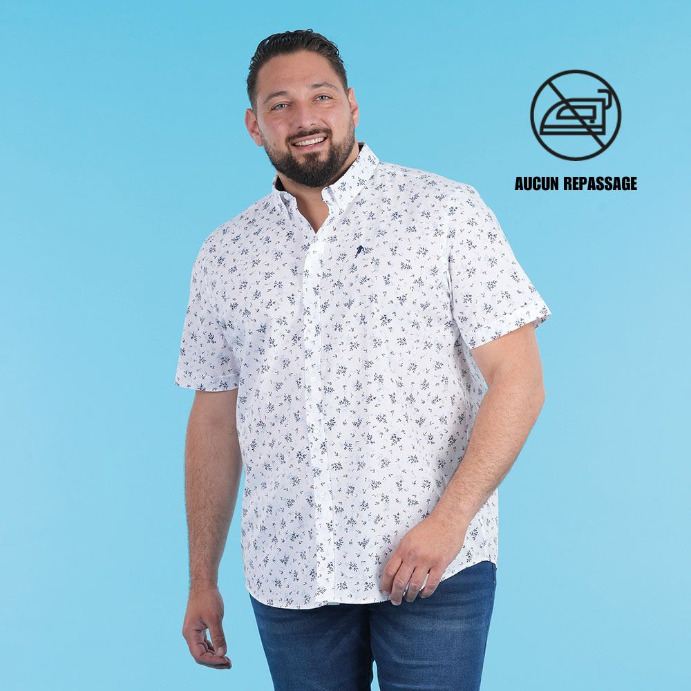 Chemise homme à manches courtes, coupe droite et confortable. Son tissu blanc est décoré d’un imprimé fleuri bleu marine discret, qui apporte une touche d’élégance estivale. Légère et respirante, cette chemise est idéale pour un look décontracté chic, parfaite pour les journées ensoleillées ou les sorties estivales.