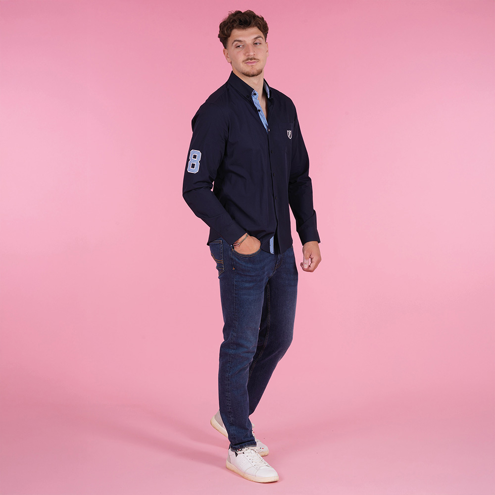 Élégante et moderne, cette chemise bleu marine à manches longues est un incontournable du vestiaire masculin. Idéale aussi bien pour un style casual chic que pour une tenue plus habillée. Les détails contrastants à carreaux au niveau de la boutonnière et du col apportent une touche d’originalité.