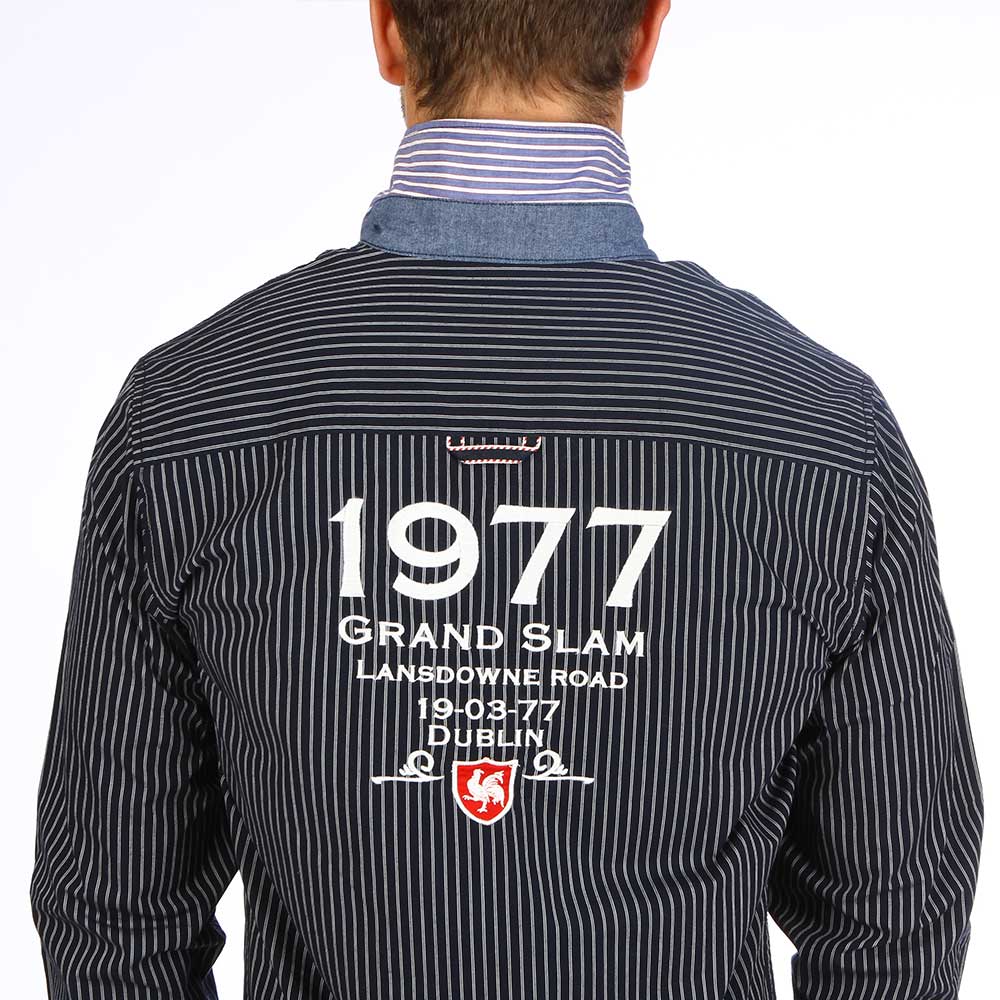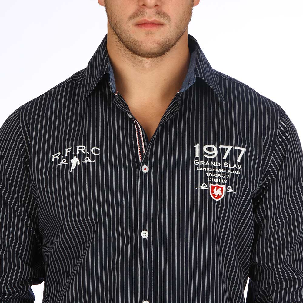 Chemise rugby manches longues Ruckfield à fines rayures marines et blanches contient des broderies sur la poitrine et dans le dos Lansdowne Road. Ce modèle est disponible en grandes tailles jusqu'au 4XL.