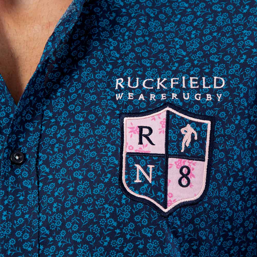 L'écusson poitrine We are rugby s'épanouit sur fond floral.