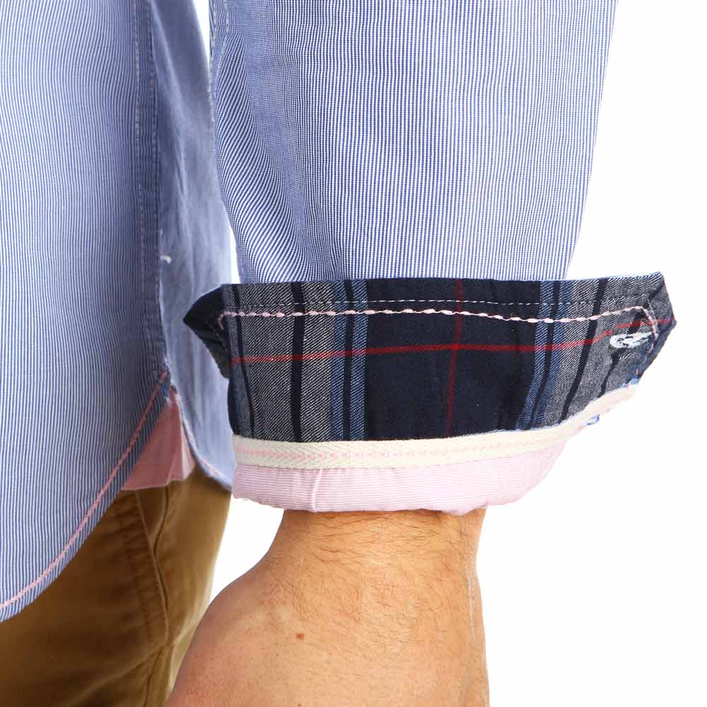 Cette chemise rugby finement rayée ciel et blanc, 100% coton, est appréciée pour sa coupe classique et ses broderies poitrine et dos. Contraste revers de manches et intérieur du col.
