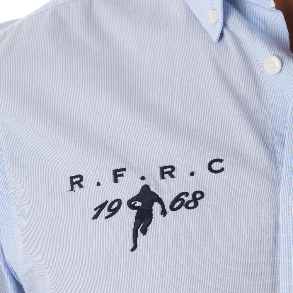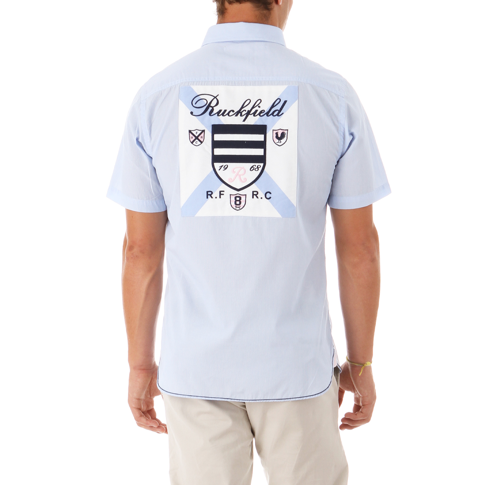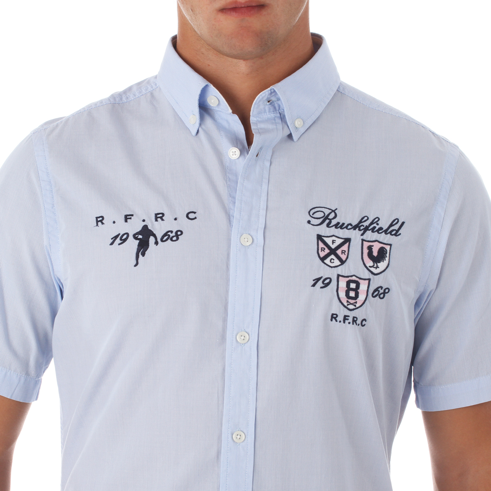 Chemise manches courtes bleu/blanc, 100% coton. Broderies poitrine, dos et doublure blanche du col.