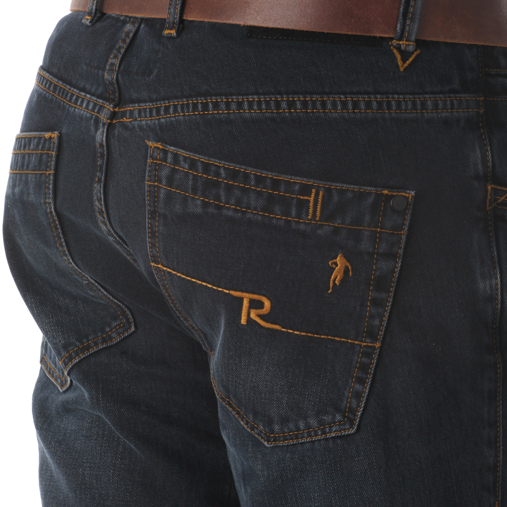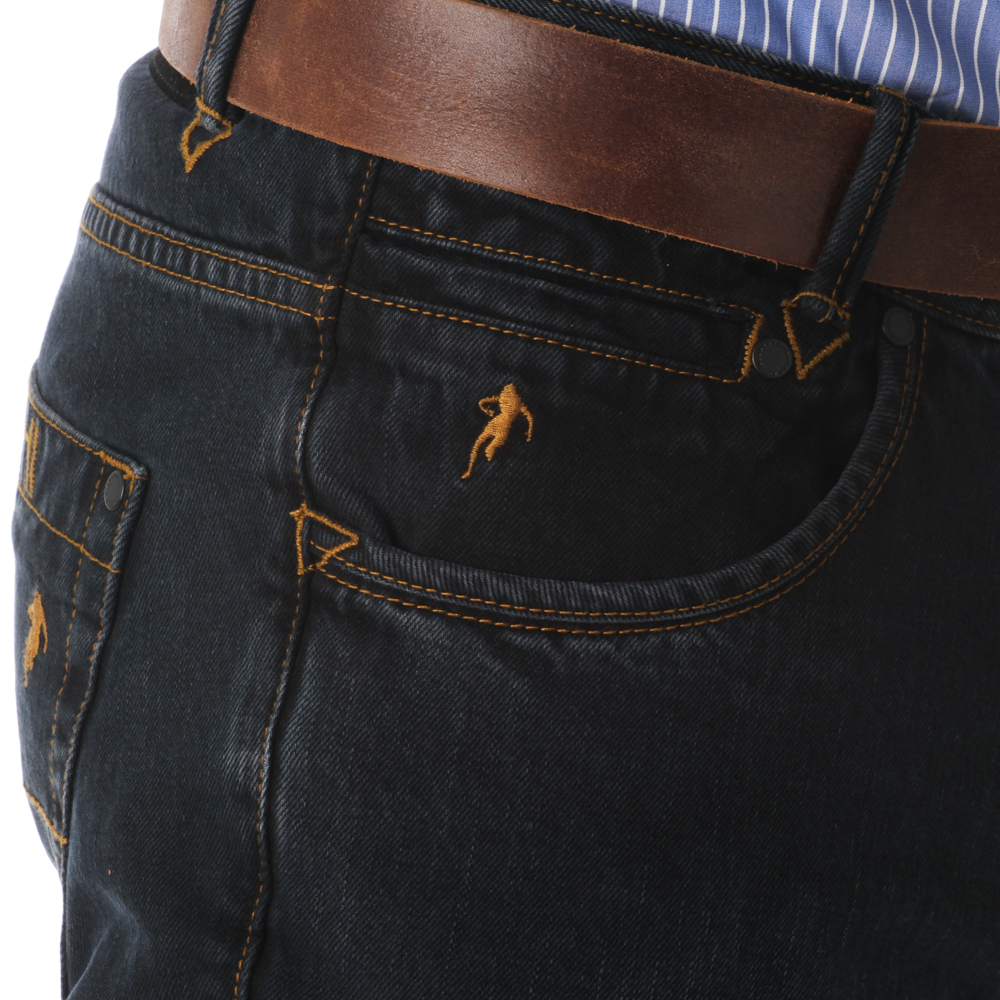 100% coton, avec 5 poches et une braguette zippée, ce jean bleu coupe regular se distingue par des surpiqûres camel et par un logo brodé sur la poche.