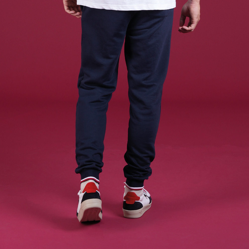 Ce jogging bleu marine avec liseré bleu, blanc, rouge au bas des jambes combine confort ultime et touche sportive chic. Sa coupe moderne et son design soigné en font une pièce incontournable pour vos séances de sport ou vos moments de détente.