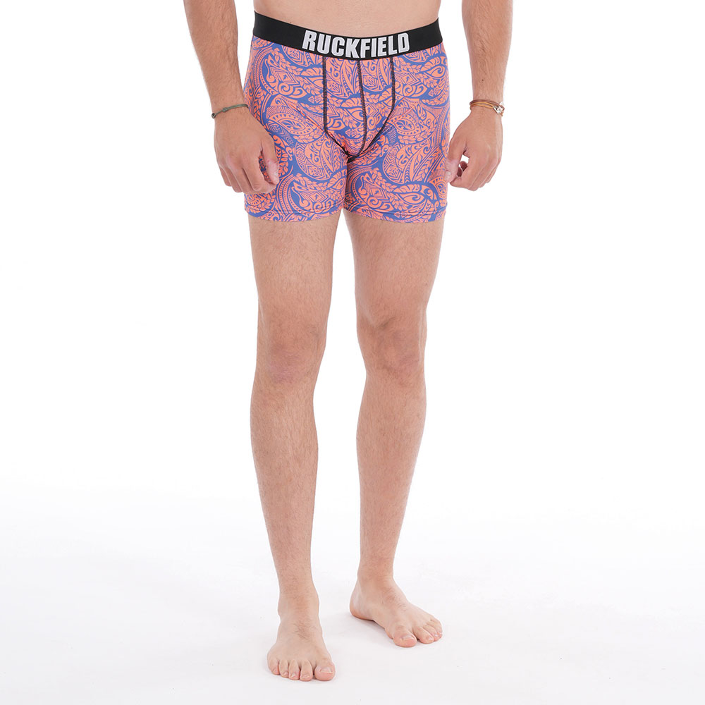 1 boxer bleu moyen avec motifs maori orange vif, pour une touche graphique et moderne.
