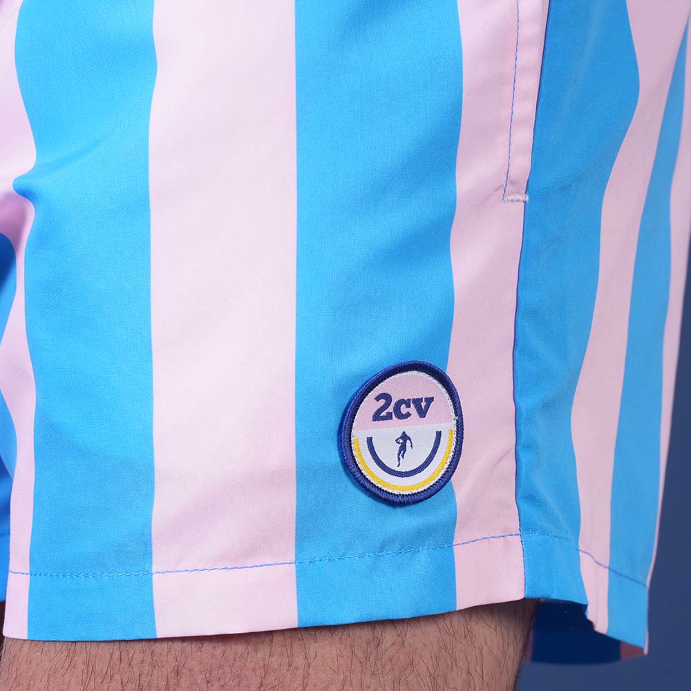 Adoptez un style estival audacieux avec ce maillot de bain à larges rayures bleu turquoise et rose, inspiré de l’univers 2CV. Doté d’un cordon de serrage contrastant, de poches pratiques et d’une poche arrière boutonnée, il allie confort et fonctionnalité. Sa matière légère et à séchage rapide vous garantit un maximum de confort, sur la plage comme à la piscine.