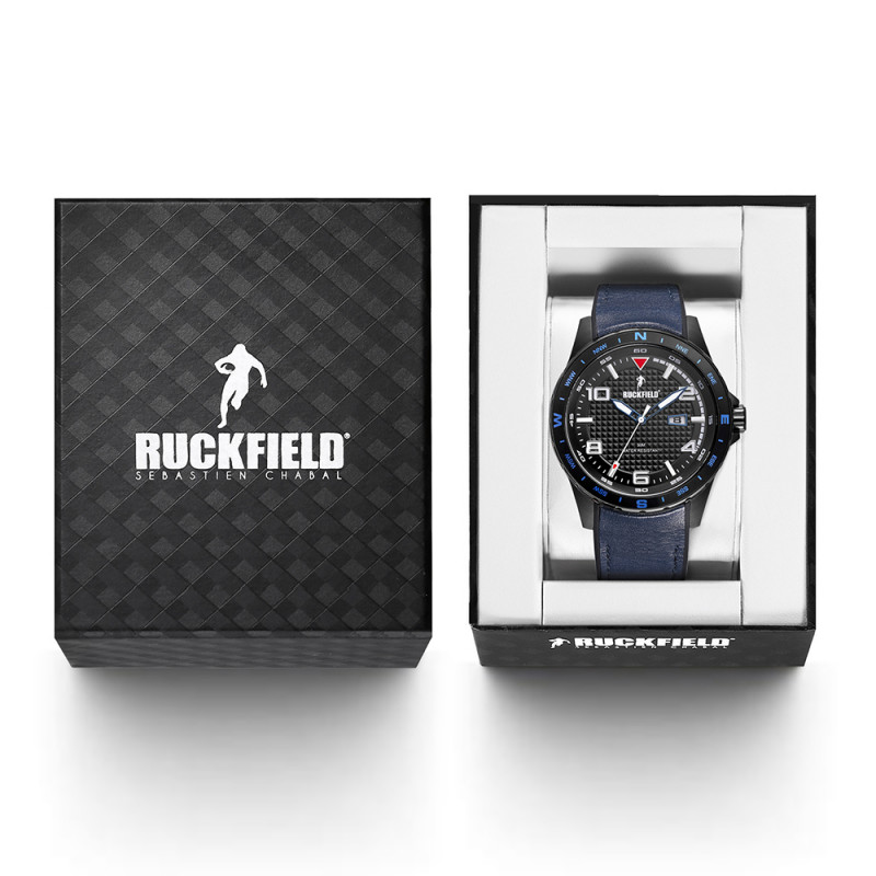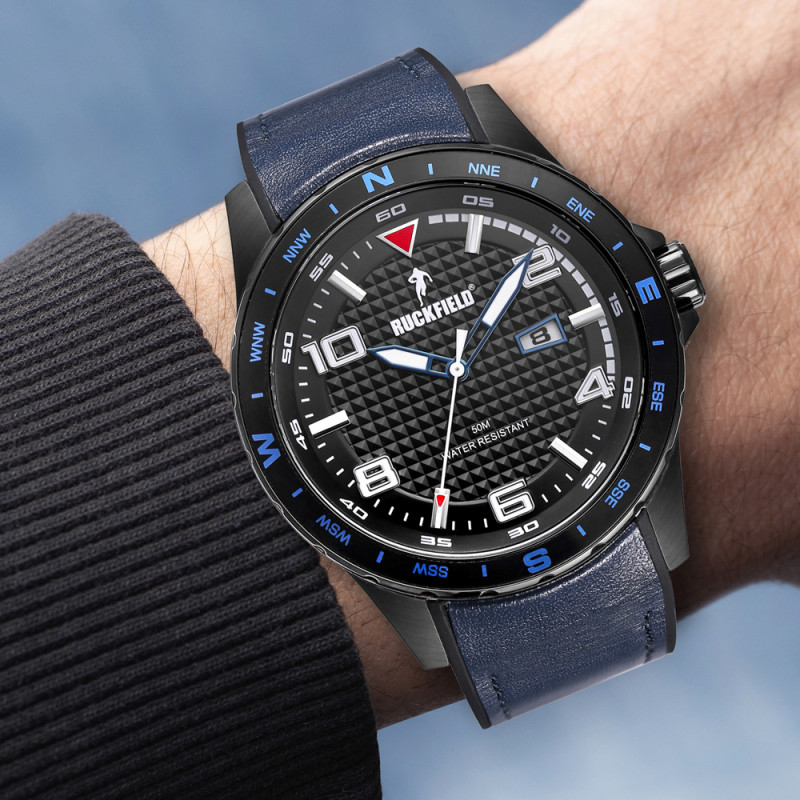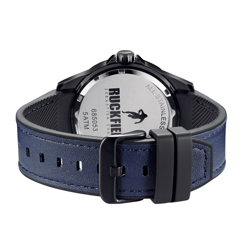 La montre Ruckfield 685053 est une montre en acier noire. Sa lunette est gravée des repères cardinaux bleus. Le Cadran est noir, rehaussé d’index en acier. Cette montre est étanche 50m (5ATM). Le bracelet est en deux matières, caoutchouc et cuir de vachette..