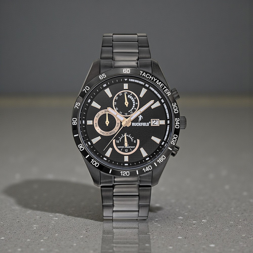 Affirmez votre personnalité avec cette montre RUCKFIELD au design sportif et raffiné. Dotée d’un bracelet en acier noir brossé et d’un cadran multifonction, elle allie robustesse, style et technologie.