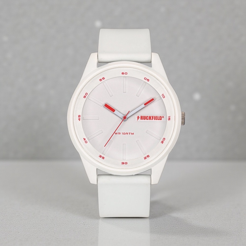 Cette Montre Homme Ruckfield - 685193 intègre un affichage analogique. Le boîtier rond fait en résine a un diamètre de 44 mm, avec une couleur blanche qui se marie parfaitement avec le bracelet en silicone. Son mouvement est alimenté par quartz. La montre est sécurisée avec une boucle simple et protégée par un verre plastique. Résistante à l'eau jusqu'à 100 m (10 ATM), elle est idéale pour une utilisation quotidienne. L'image démontre une finition soignée, confirmant son élégance et son style unique.