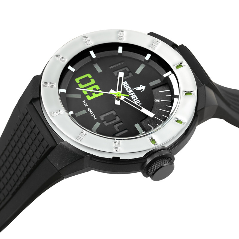 Elle est étanche 100m (10ATM). Elle est composée d'un bracelet en silicone très résistant et d'une bague en métal gris qui entoure le boitier de grande taille. La montre Ruckfield 685100 permet une lecture facile de l’heure pendant les activités sportives grâce a son cadran de grande taille très lisible.
