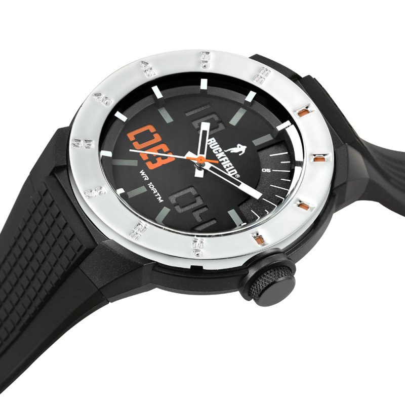 Elle est étanche 100m (10ATM). Elle est composée d'un bracelet en silicone très résistant et d'une bague en métal gris qui entoure le boitier de grande taille. La montre Ruckfield 685098 permet une lecture facile de l’heure pendant les activités sportives grâce a son cadran de grande taille très lisible.