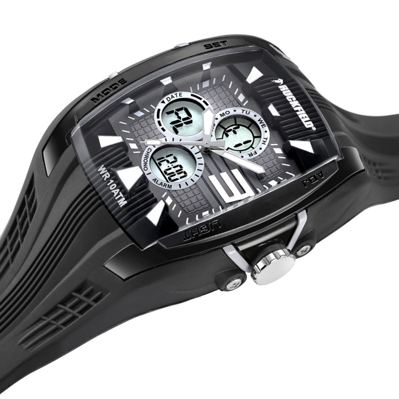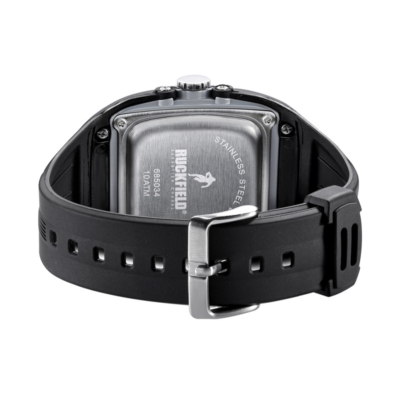 La Montre RUCKFIELD 685034 est une montre de Sport pour Homme inspirée du design des casques de Rugby. Elle est équipée d’un mouvement quartz de haute précision analogique et digital qui comporte une alarme, un chronomètre, la date, un double fuseau horaire. Le boitier en résine est renforcé et le fond en acier est vissé pour augmenter l’étanchéité. Le bracelet en plastique est très résistant.