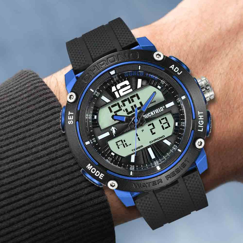 La montre Ruckfield 685089 est une montre sport homme équipée d’un mouvement de haute précision Analogique et digital. Elle comporte un chronomètre, une alarme, un deuxième fuseau horaire.