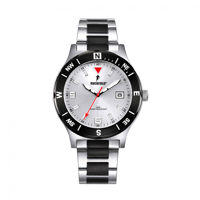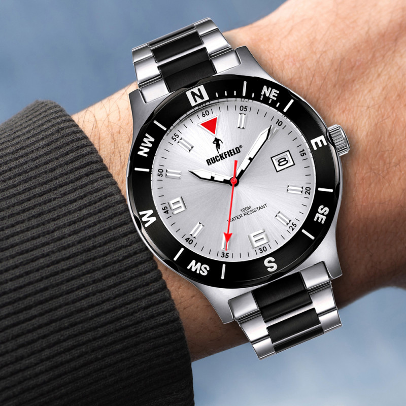 La montre Ruckfield 685026 est une montre sport homme entièrement en acier. Son boitier rond de 40mm de diamètre est rehaussé d’une lunette acier noir et le cadran blanc est orné d’index frappés qui permettent une lecture de l’heure très précise.